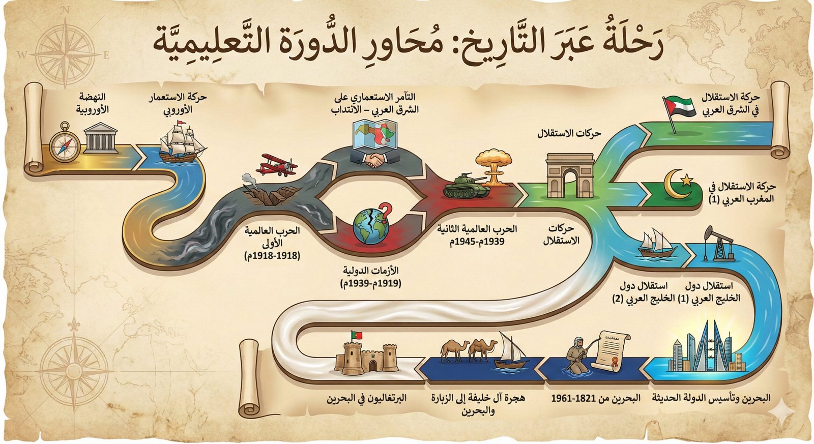 صُمِّمت هذه الدورة لتأخذكم في جولة ممتعة لفهم أهم المحطات التاريخية التي أثّرت في العالم وفي منطقتنا العربية، وستجدون فيها شرحًا تفاعليًا مبسّطًا يساعدكم على ربط الأحداث ببعضها وفهم خلفياتها وتأثيرها اليوم.